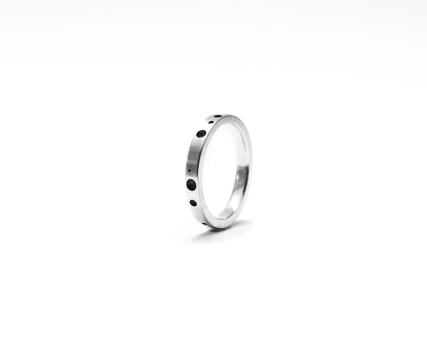 Anillo macizo con muescas oxidadas en plata de ley 925. La superficie tiene un acabado mate.